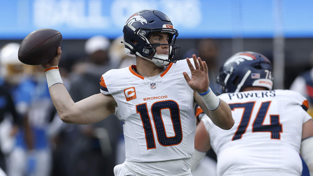 INGLEWOOD, CALIFORNIA - SEPTEMBER 21: Bo Nix #10 of the Denver Broncos throws against the Los Angeles Chargers during the NFL 2025 game at SoFi Stadium on September 21, 2025 in Inglewood, California. (Photo by Ronald Martinez/Getty Images)Photo: Ronald Martinez / Getty Images Sport / Getty Images