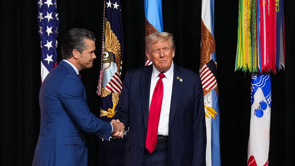 QUANTICO, VIRGINIA - SEPTEMBER 30: (EDITOR'S NOTE: Alternate crop) U.S. President Donald Trump (R) greets U.S. Secretary of War Pete Hegseth as he arrives to speak to senior military leaders at Marine Corps Base Quantico on September 30, 2025 in Quantico, Virginia. In an unprecedented gathering, almost 800 generals, admirals and their senior enlisted leaders have been ordered into one location from around the world on short notice. (Photo by Andrew Harnik/Getty Images)Photo: Andrew Harnik / Getty Images News / Getty Images