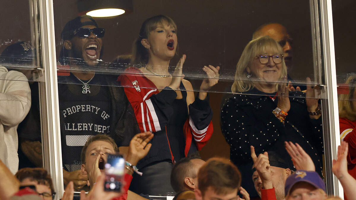 KANSAS CITY, MISSOURI - OCTOBER 12: Taylor Swift and Donna Kelce cheer before the game between the Kansas City Chiefs and the Denver Broncos at GEHA Field at Arrowhead Stadium on October 12, 2023 in Kansas City, Missouri. (Photo by David Eulitt/Getty Images)Photo: David Eulitt / Getty Images Sport / Getty Images