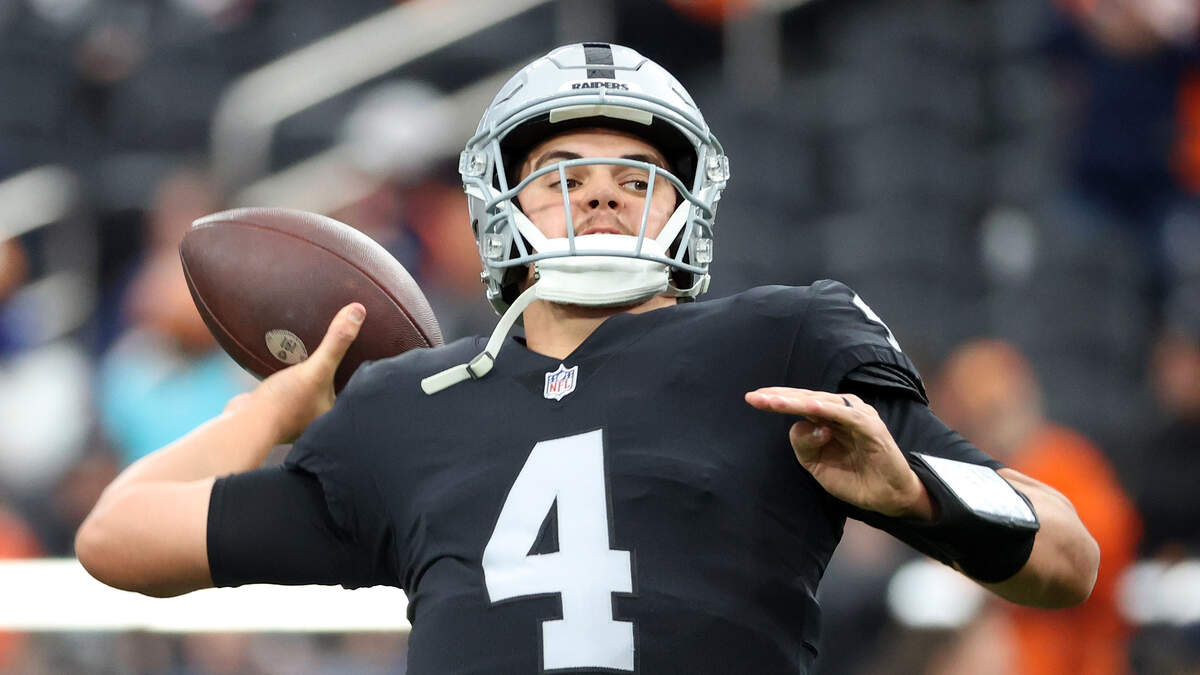 LAS VEGAS, NEVADA - JANUARY 07: Aidan O'Connell #4 of the Las Vegas Raiders warms up prior to the game against the Denver Broncos at Allegiant Stadium on January 07, 2024 in Las Vegas, Nevada. (Photo by Ian Maule/Getty Images)Photo: Ian Maule / Getty Images Sport / Getty Images